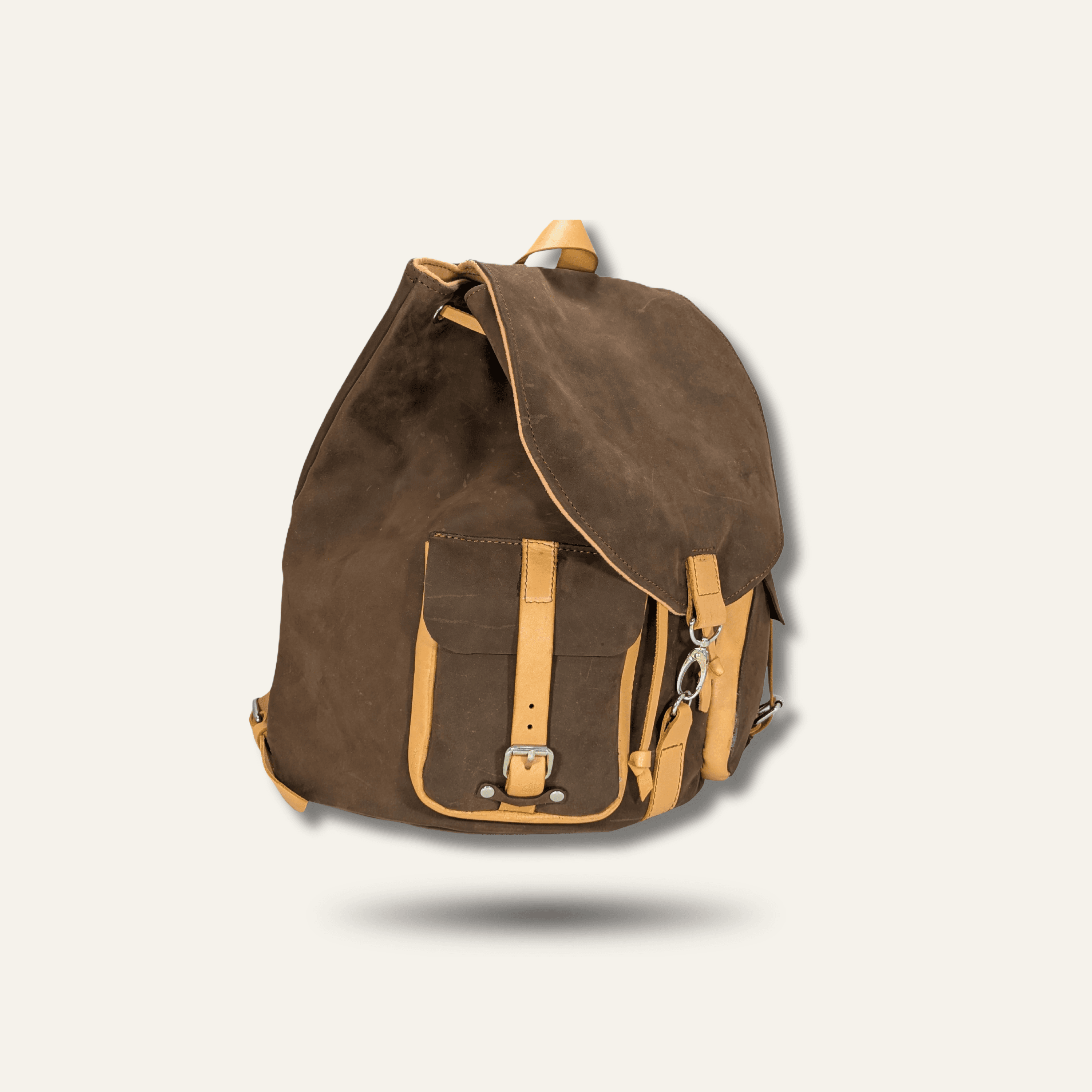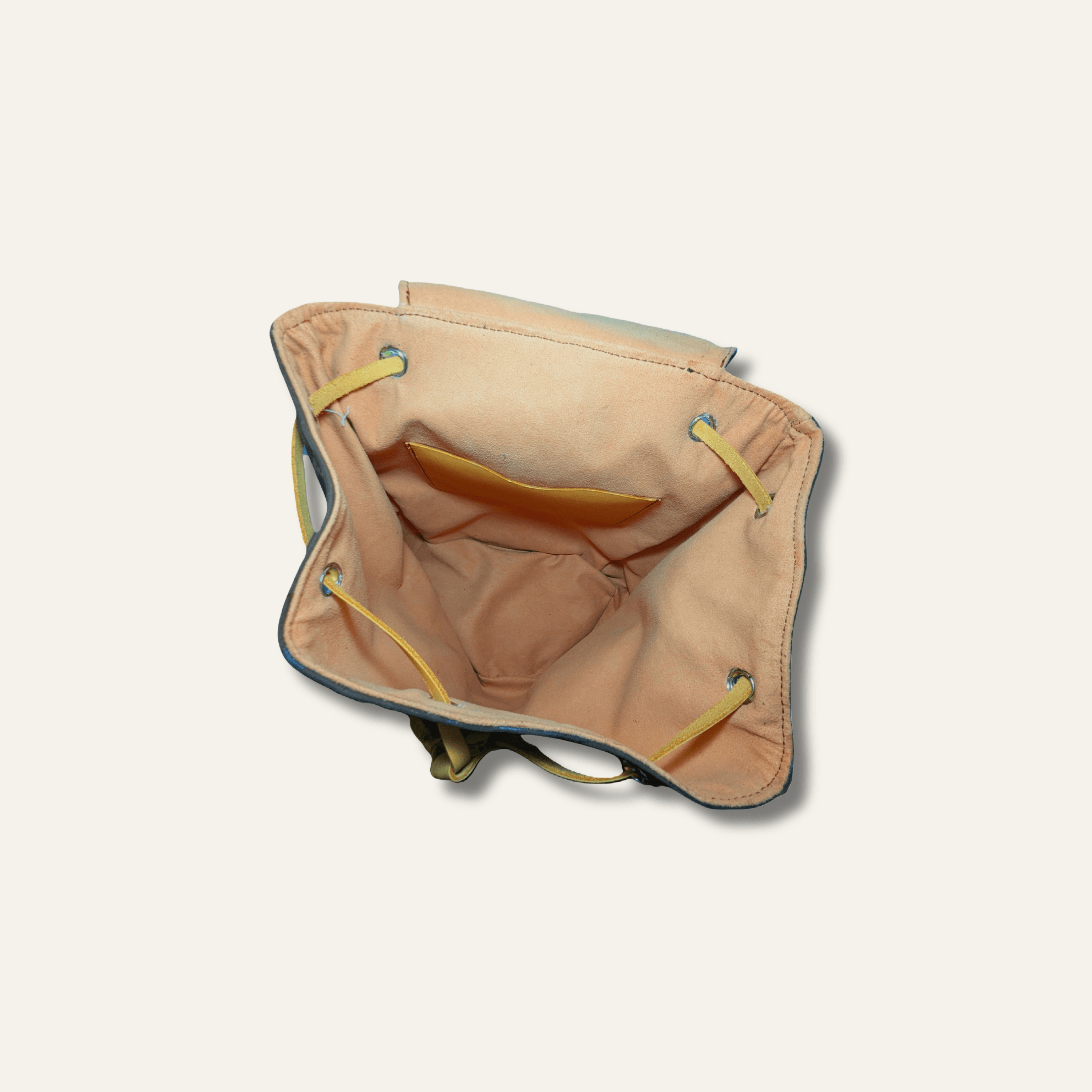 Inside, the bag is lined with a thick fabric for durability and structure, featuring an integrated leather pocket for essentials. The drawstring closure and large leather flap keep belongings secure, while nickel hardware, rivets, and buckles ensure reliability through years of use.